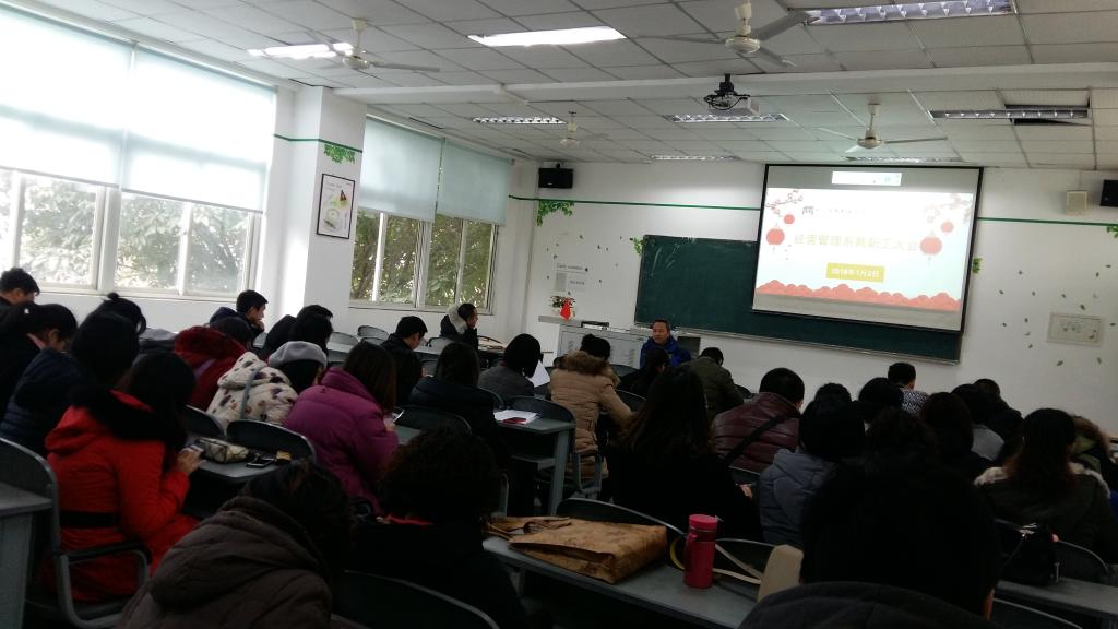 2018年1月2日下午2点整,经营管理系于第一教学楼202室召开全系教职工会议。出席会议的有经管系主任梁栋,系党总支书记郑海波,系副主任王琦,系党政办主任朱永泉,各教研室负责人,全体辅导员和行政人员,会议由系党...
