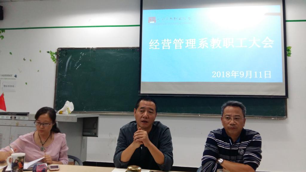 2018年9月11日下午2时30分,经营管理系于第一教学楼202室召开全系教职工会议。出席本次会议的有经管系主任梁栋,系党总支书记郑海波,系副主任王琦,全系教职工,会议由系主任梁栋主持。 一、梁主任对全系工作总体部...