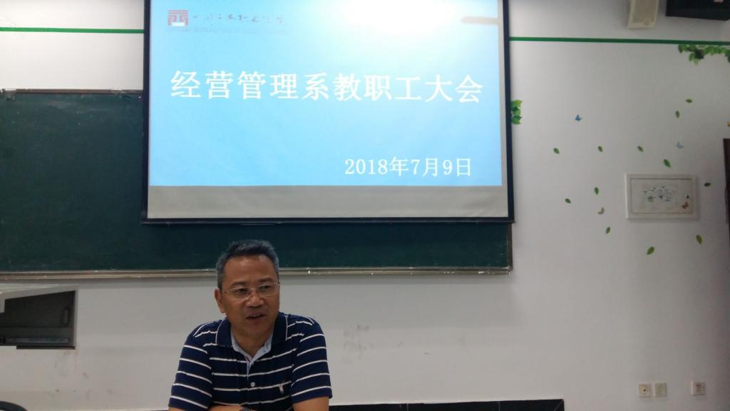2018年7月9日上午10点30分,经营管理系于第一教学楼202室召开全系教职工会议。出席会议的有经管系主任梁栋,系党总支书记郑海波,系副主任王琦,系党政办主任朱永泉,各教研室负责人,全体辅导员和行政人员,会议由系...
