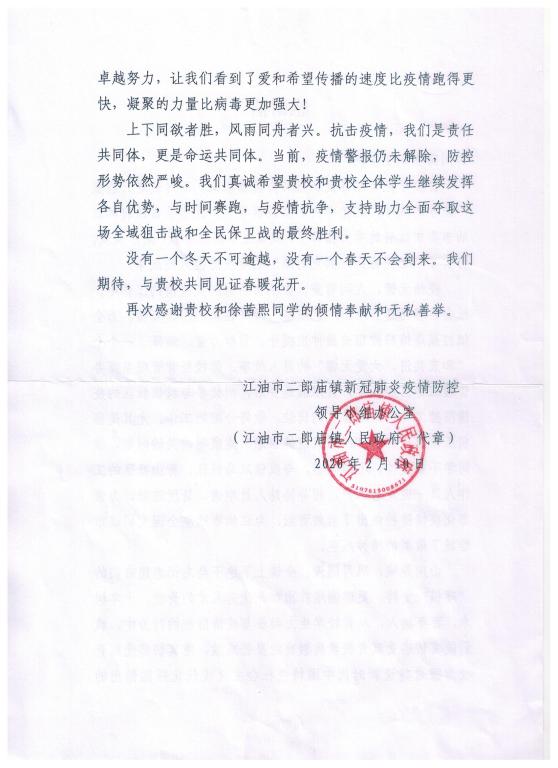 经营管理系20级商务管理班徐茜熙同学在去年新冠肺炎爆发期间,积极参加到江油市二郎庙镇社区的疫情防控工作中,不辞辛苦,为当地常态化疫情防疫工作作出了贡献。江油市二郎庙镇防疫办为表达感谢之情,特向万象城发来感谢信,充分肯定了徐茜熙同学的担当与奉献。