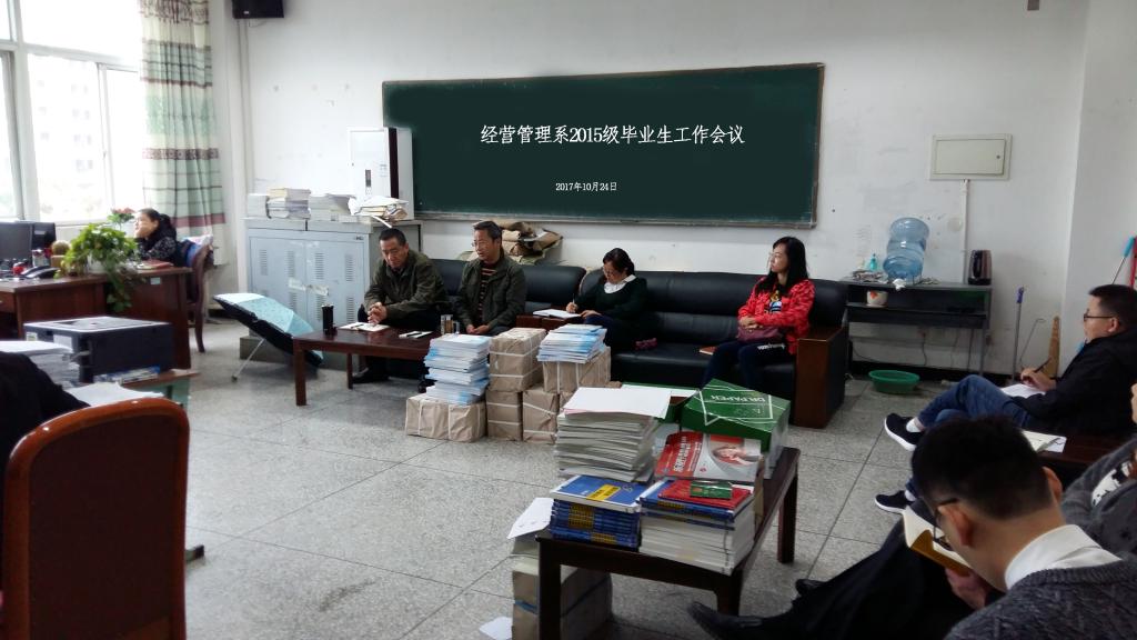2017年10月24日上午9点30分,经营管理系于第一教学楼306室召开毕业生工作会议。出席会议的有经管系主任梁栋,系党总支书记郑海波,系副主任王琦,系党政办主任朱永泉,各教研室负责人,全体辅导员和行政人员。