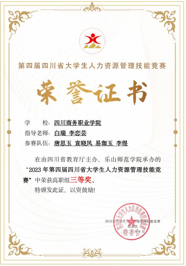 学院实践教学中心、经营管理系人力资源管理教研室在赛前精心组织筹备,由白瑞、李恋芸,何军强三位老师指导2022级人力资源管理专业8名同学组成两支队伍参赛,在历经激烈竞争后,两队双双荣获大赛高职组三等奖。