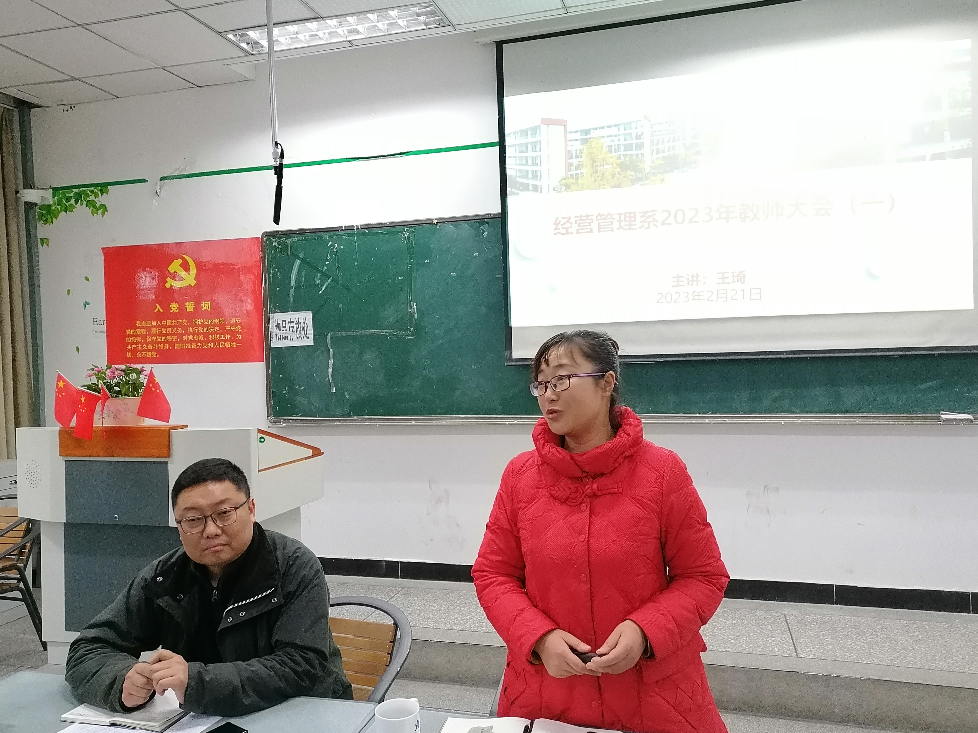 2023年2月21日上午10:00,经营管理系全体教职工于第一教学楼202室召开全系教职工会议。出席本次会议的有学院党委副书记张军同志、学院副院长王军同志、学院组织部副部长王钦同志、经营管理系主任王琦同志、经营管理系党总支书记杨洪同志、人文社科部主任张一风同志,各专业负责人、全体行政人员、辅导员。会议由系主任王琦主持。