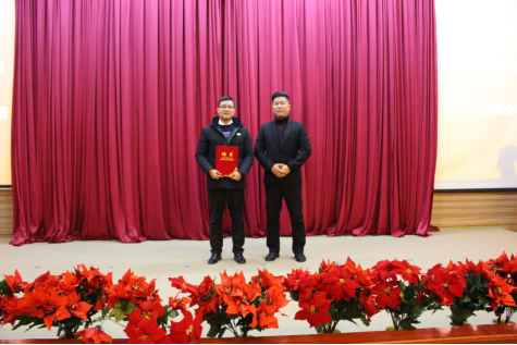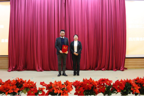 眉山市三人行创业服务有限公司总经理助理、眉山三人行创业孵化园副主任、党支部副书记李陈向万象城体育awcsport电子商务专业教师易博颁发兼职聘书。