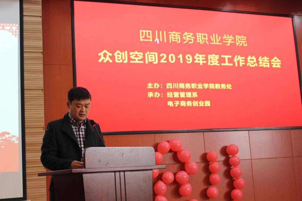 为了深入贯彻落实“《国务院关于推动创新创业高质量发展打造“双创”升级版的意见》(国发〔2018〕32号)”等文件精神,总结2019全年工作,表彰新公司,学院众创空间于12月19日在商务交流中心召开总结大会。出席总结会的有温江区就业局副局长彭东、温江区就业局创业促进科科长易飞、温江区就业局工作人员卢杉杉、眉山市三人行创业服务有限公司总经理冉淋源、三人行创业孵化园主任助理邓涛、眉山市三人行创业服务有限公司孵化事业部部长孙臻、学院副院长向宏志、教务处处长黄松、财务资产管理处处长杜先林、学生工作处处长王军、督导办主任刘小平、经营管理系主任梁栋、经营管理系党总支书记郑海波、经济贸易系主任朱贵水、信息技术系主任赵天宏、会计系副主任李莉、创业指导教师、空间管理团队、以及学生创客齐聚一堂,总结经验,共话发展。会议由经营管理系主办,经营管理系副主任王琦主持。