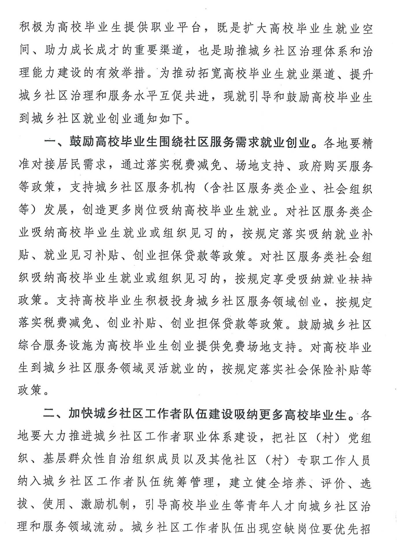 一、各地要加快社区专职工作者职业体系建设,完善社区专职工作者“选育用管”制度,加大从高校毕业生中招用社区专职工作者力度。积极引导符合条件的高校毕业生进入社区“两委”班子,社区“两委”集中换届时,班子成员中原则上要有1名35岁以下的高校毕业生。加大从符合条件的社区专职工作者中招录(聘)公务员或事业单位工作人员特别是街道(乡镇)干部力度,不断拓宽到社区就业高校毕业生成长空间。