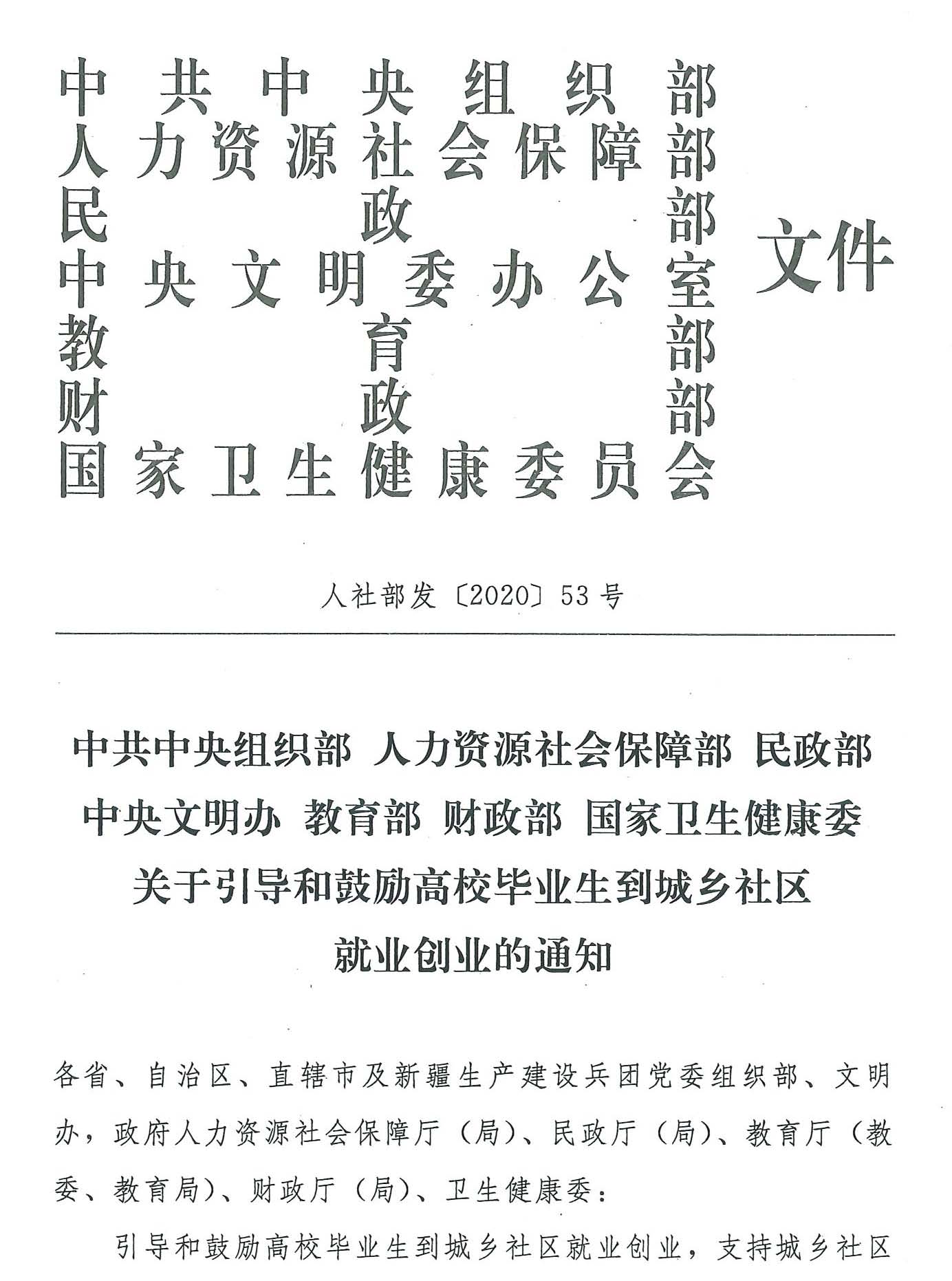 为推动拓宽高校毕业生就业渠道、提升城乡社区治理和服务水平共促共进,中共中央组织部、人力资源社会保障部等7部门联合印发了《关于引导和鼓励高校毕业生到城乡社区就业创业的通知》(人社部发〔2020〕53号),现转发你们,请结合以下意见一并抓好贯彻落实。
