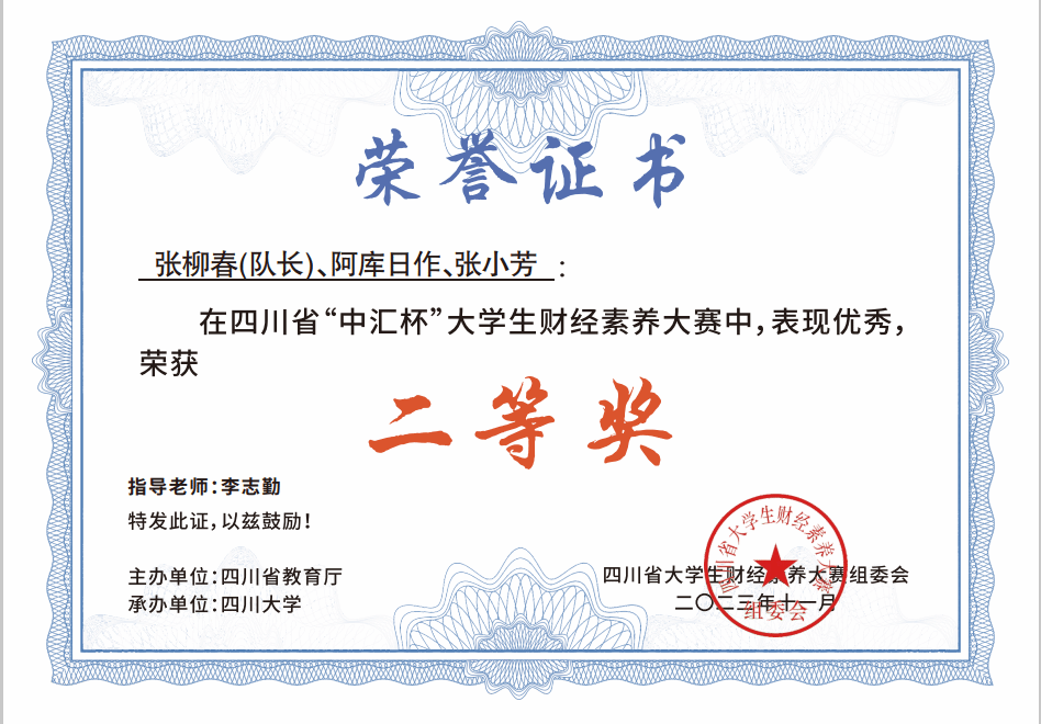 近日,由四川省教育厅主办、四川大学承办的2023年“中汇杯”四川省大学生财经素养大赛决赛落下帷幕,经过激烈的角逐,万象城李志勤、雷殷睿指导的学生团队获得省赛团体三等奖的好成绩。