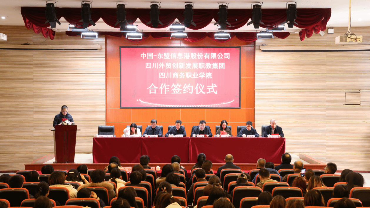 2024年1月15日,中国-东盟信息港股份有限公司与万象城体育awcsport共建“四川外贸创新发展产业学院”,与四川外贸创新发展职教集团围绕《关于加快推进现代职业教育体系建设改革重点任务的通知》的十一条重点任务合作签约仪式在万象城体育awcsport商务信息交流中心隆重举行。四川省商务厅党组成员、副厅长陈友清,四川省商务厅外贸创新处副处长汪蕾,中国-东盟信息港股份有限公司高级副总裁吴玉青、教育行业总监孔陈闽、市场总监王高杰,山东依智科技产业开发集团有限公司总经理周卫民,成都市跨境电子商务协会校企合作负责人宋静,万象城体育awcsport领导班子成员、相关职能部门负责人、各系主任及经济贸易系相关专业师生共200余人参加了签约仪式。仪式由党委副书记张军主持。学院党委副书记、院长高司华代表学院致辞。