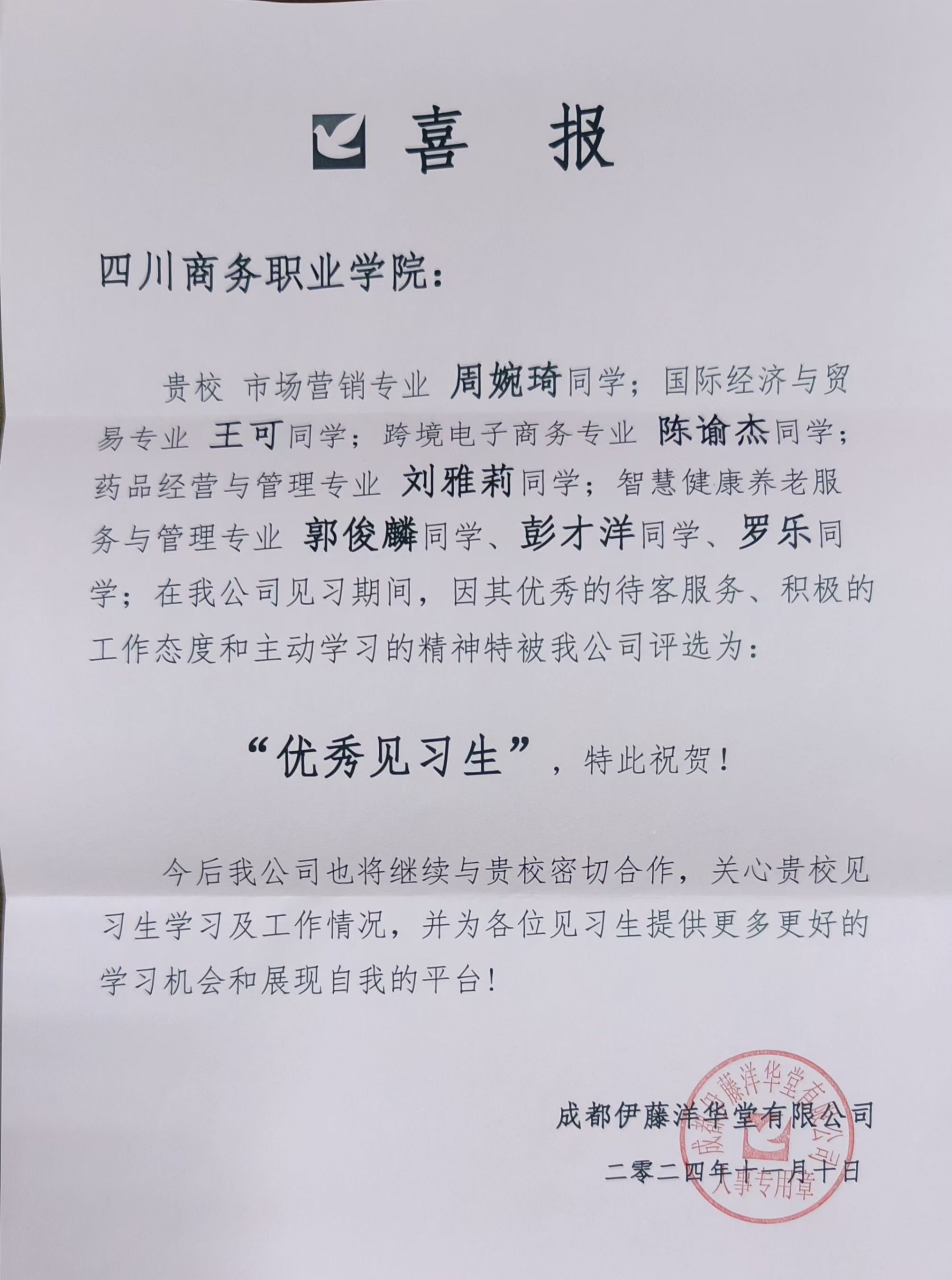 近日,从学院校企合作单位成都伊藤洋华堂有限公司传来喜讯,经济贸易系2022级周婉琦等七名学生在该公司第三季度见习生中表现优异,被评定为优秀见习生。