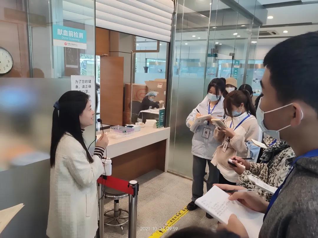 紧接着同学们来到发血处,在里面有低温保存的悬浮红细胞,普通冰冻血液,新鲜冰冻血液等。李老师解释道低温保存血液的原因是为了保证血细胞的活性,还有达到抑制微生物生长繁殖的作用,而使用抗凝剂是为了防止血液凝结。最后,李老师向我们讲到一般抽血多少毫升。据了解,一般人抽血在200ml到300ml之间。在出献血中心的路上,我们还了解到无偿献血者本人和家人用血报销比例、时间、方法。