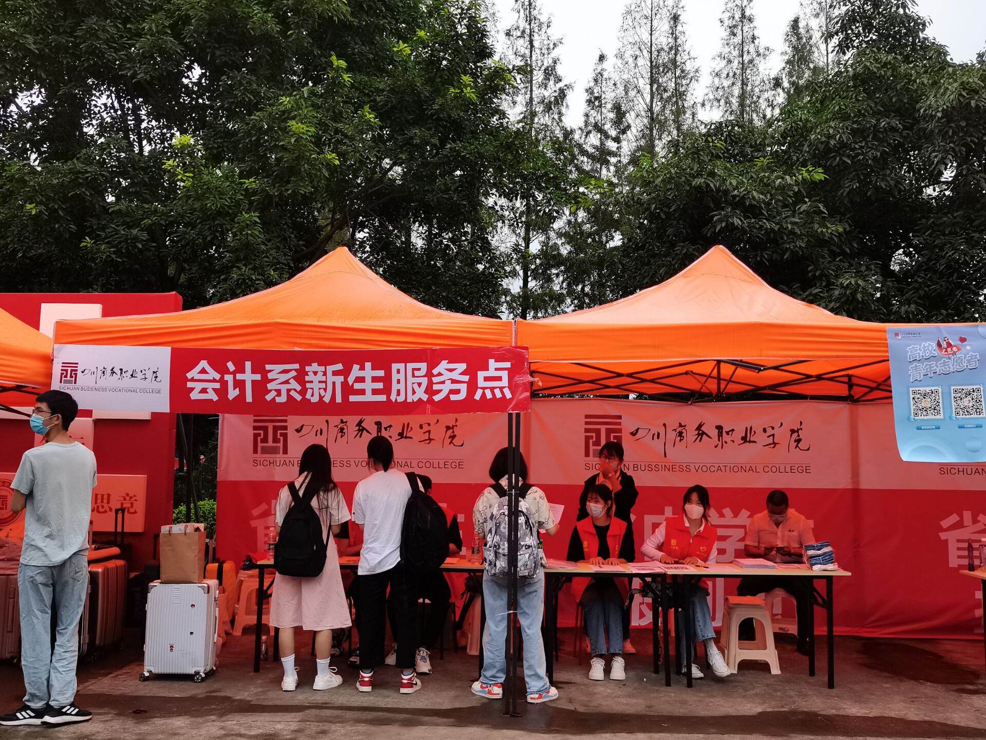 在地铁口迎新的志愿者同学们在等待校车的间隙,热情地为各位新生和他们的家长解答对新学校的疑惑。校车到来后,协助新生将行李搬上校车来到学校。学校里面,大二的学长学姐们在各自的位点为大一的学弟学妹服务。从进入校门开始就有志愿者带领新生一步步走完报道流程。