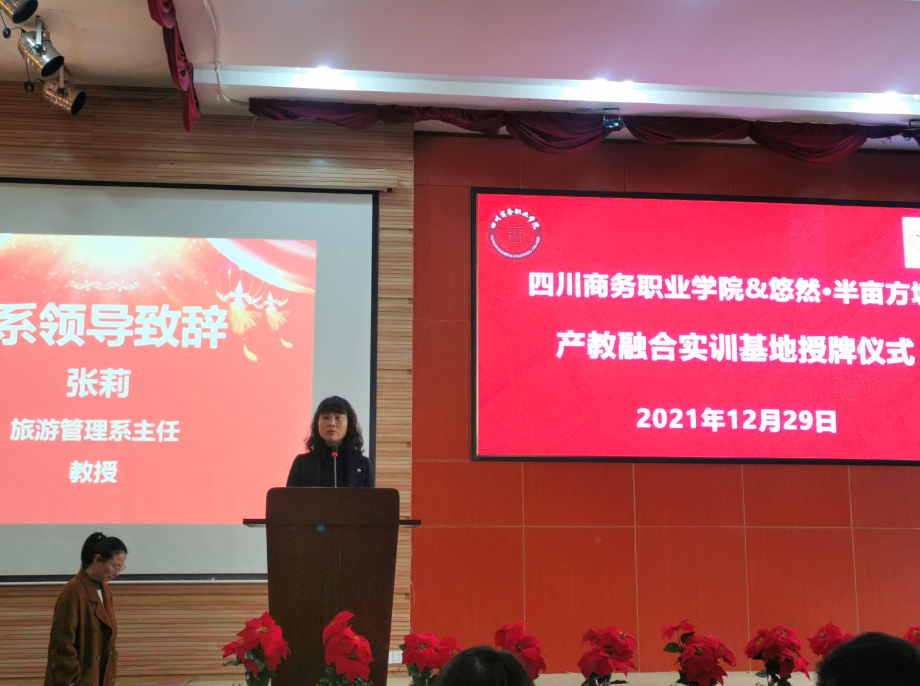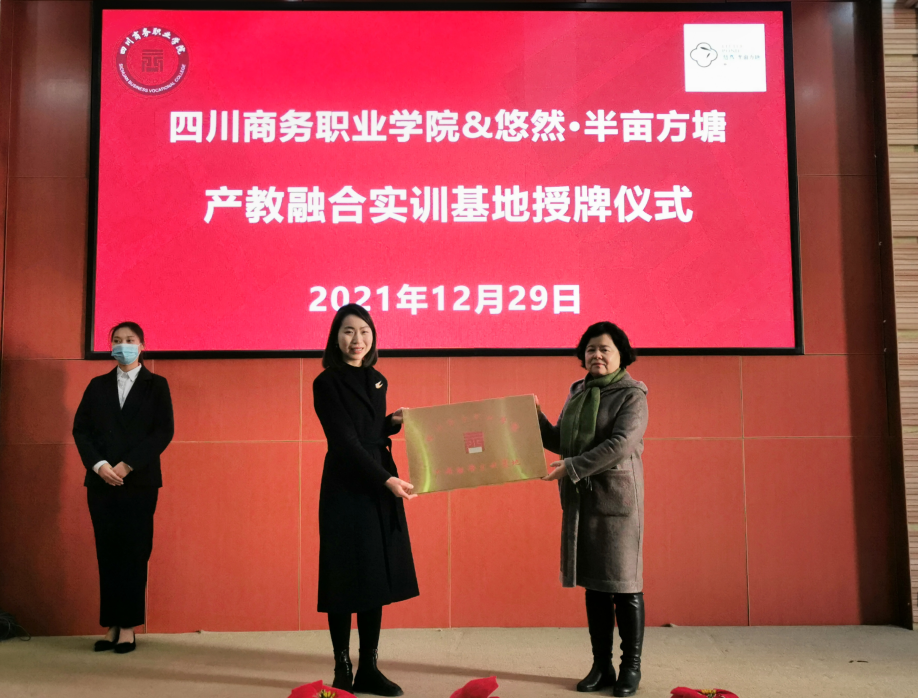 12月29日,万象城体育awcsport与半亩方塘产教融合实训基地授牌仪式在和盛校区隆重举行。成都悠然半亩方塘酒店管理有限公司运营副总王范玲,学院党委委员、副院长许丹雅教授,教务处处长黄松教授,旅游管理系领导,以及校企双方代表出席授牌暨师资互聘仪式。