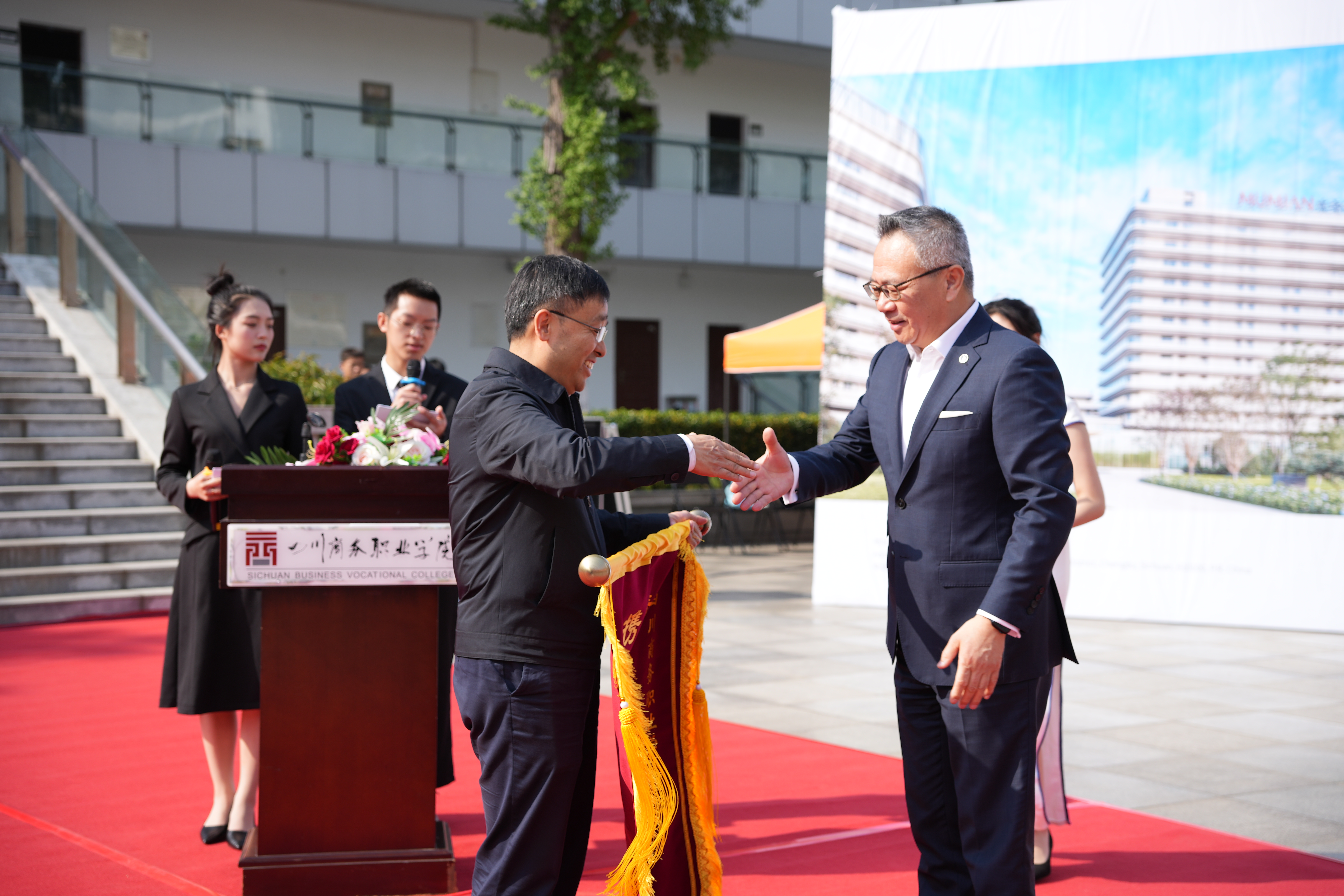 康璐、成都东安湖木棉花酒店总经理缪建伟分别为比赛致辞。赛前缪建伟和成都东安湖木棉花酒店人力资源总监宗典代表成都东安湖木棉花酒店向学院赠送了“精诚合作谱新篇,携手同心育英才”锦旗。旅游管理系三位教师和东安湖木棉花酒店二位行业专家共同担任本次比赛评委,旅游管理系共44名同学参与比赛。比赛内容包括仪容仪表、礼仪动作、表演节目编排三个方面。选手们依次登场,表演自然、精神饱满、动作协调,表演形式新颖,节目编排合理、连贯,展现了当代大学生的文明风采,反映了万象城学生积极向上的精神风貌。比赛间隙旅游管理系的四位同学还为现场嘉宾和观众进行了四川茉莉花茶茶艺表演。比赛最终评比选出团体一等奖1名、二等奖2名、三等奖2名,个人最佳知礼奖1名、最佳台风奖2名、最佳形象奖3名。