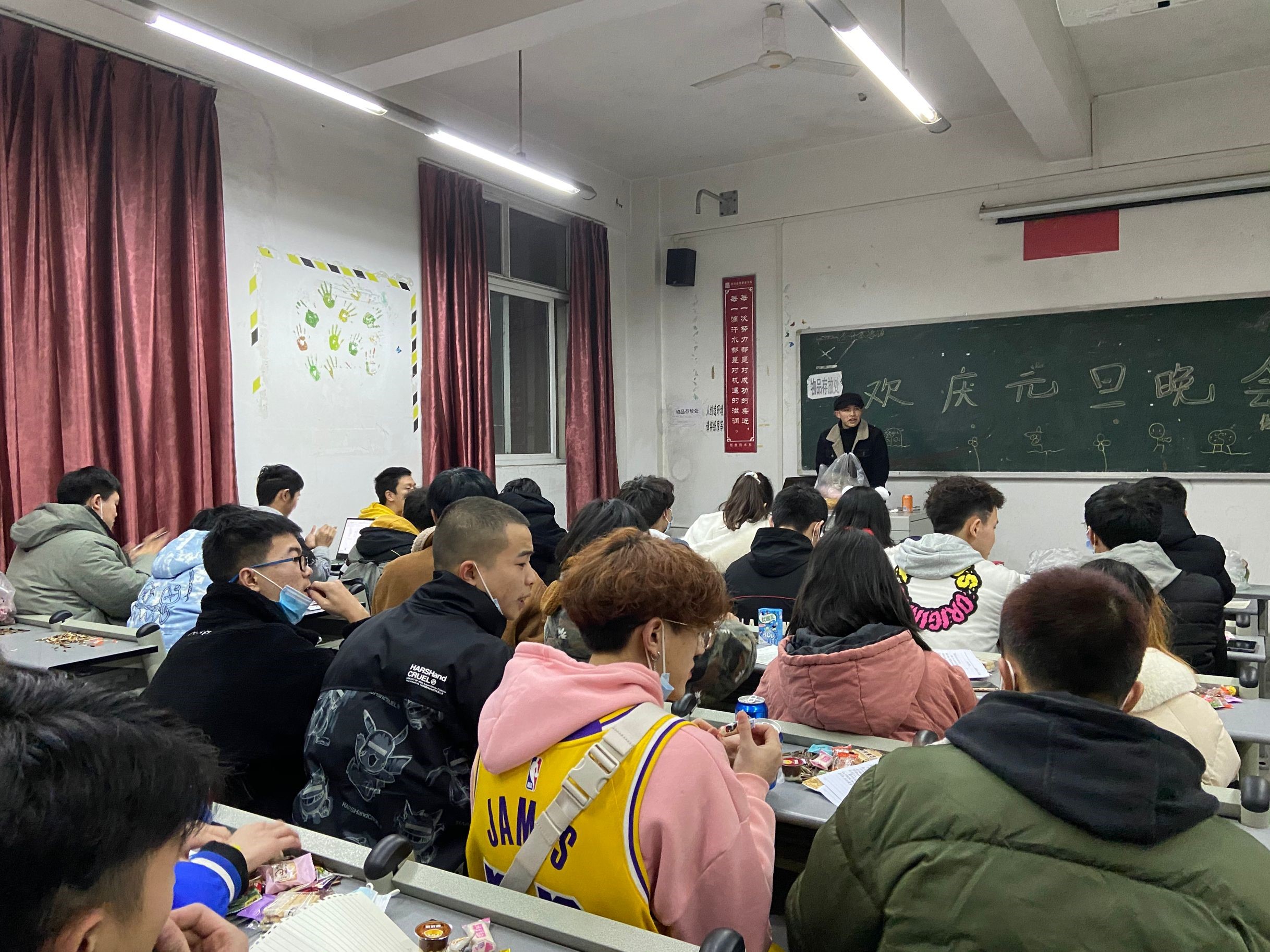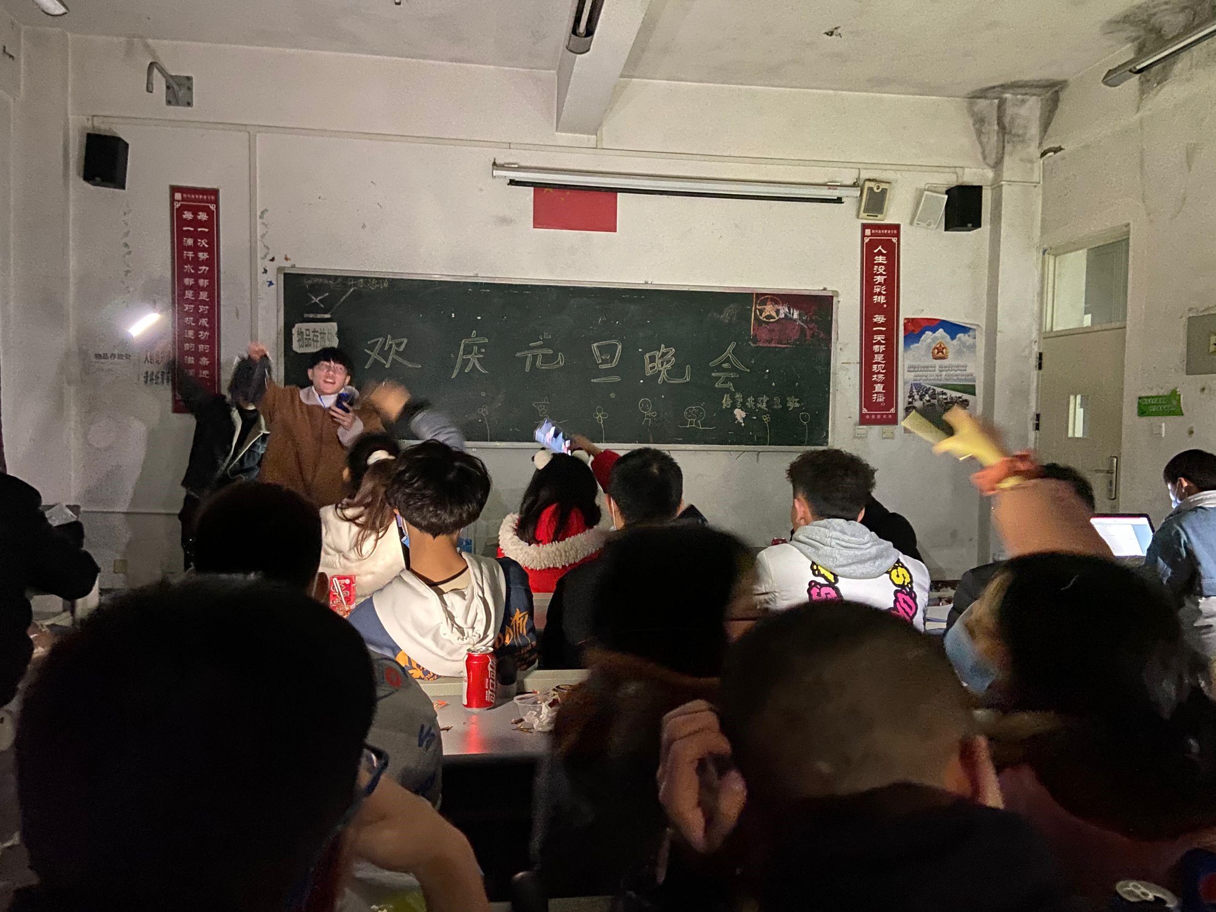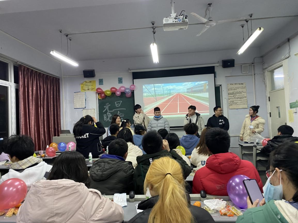 在活动开始前,各班精心准备,纷纷把自己的“家”装扮一新,彩灯、气球、零食、黑板……处处洋溢着节日的气氛,呈现出新年的气息。活动当天,首先由各班主任老师强调了元旦活动当日的注意事项,结合疫情防控开展安全教育,提醒同学们做好疫情安全防护,防患于未然。