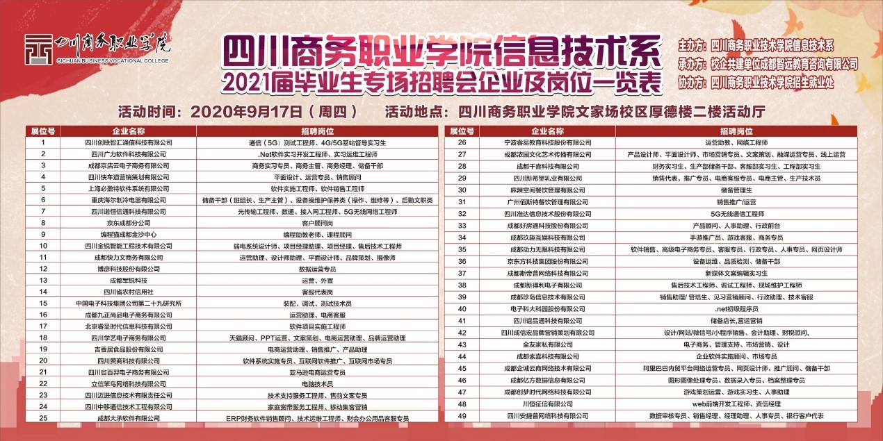 参与本次专场招聘会的企业共有49家,其中包括京东信息技术有限公司、京东方科技集团、四川省农村信用社、海尔集团、中国电子科技集团公司第二十九研究所、四川新希望乳业有限公司等知名大型企业,涉及软件开发、软件测试、网络工程师、技术支持、新媒体运营、文案策划、平面设计等437个招聘岗位。