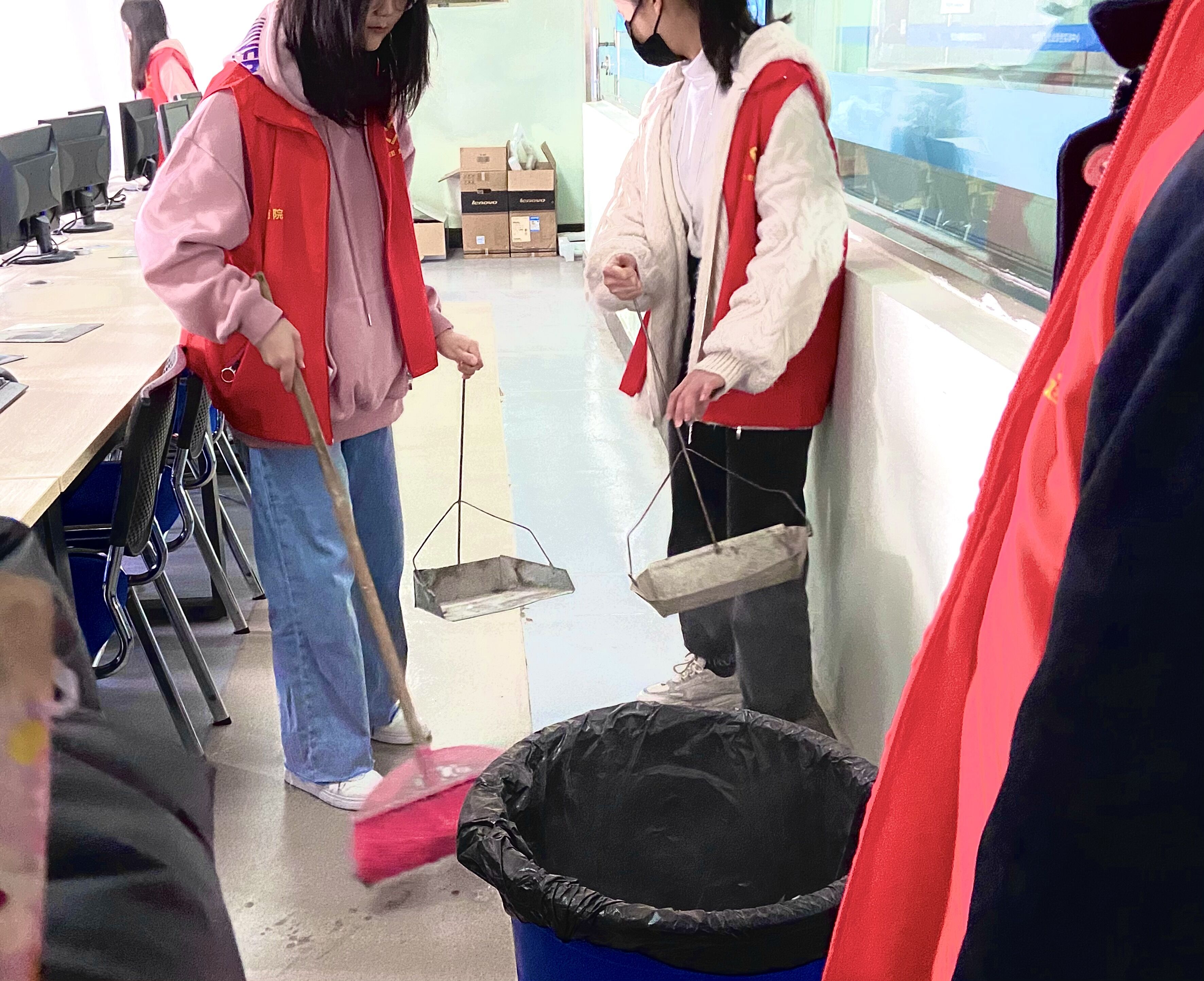 本次志愿服务场所集中在校内,服务重点在创造整洁教室环境的教室卫生清洁。活动当天上午,志愿实践部与志愿队首先向大家介绍本次服务内容、明确分工、强调安全。随后,志愿者们带着抹布、扫把等清洁工具,走进一间间实训机房、多媒体教室,积极主动、认真仔细的对教室的地面桌面等进行清扫,整理垃圾。