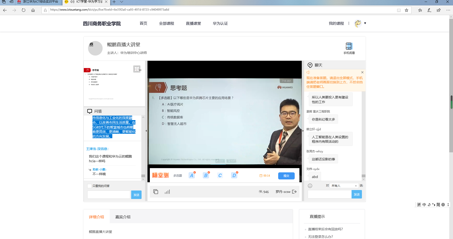 参与本次活动的师生都带着饱满的热情和探索的心理投身于直播大讲堂的学习中,收到通知消息及时回复。在课上踊跃参与互动,课下也毫不懈怠,积极讨论、相互解决问题,一展信息技术系学子探索求知的青春风采。其中,对于18级的同学们来讲,毕业的脚步悄然走近,在不久后即将步入飞速发展的社会,接触更多的新鲜事物。而通过参与本次华为鲲鹏讲堂的学习,不仅让大家在原有的知识体系中对“云计算”又有了新的认知和了解,还在课程以外拓宽了眼界,了解到华为强大的“野心”以及大数据时代的飞速发展。当然,也在不断地激励着同学们要努力拼搏、充实自己,用知识和技能武装自己,未来才能更好地适应社会。