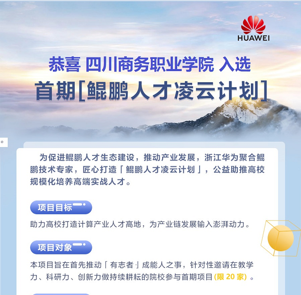 2020年4月20日,信息技术系校企共建专业经过与华为教育事业部的不断对接和落实,携手万象城体育awcsport有幸入选首期“鲲鹏人才凌云计划”。本次凌云计划共选取了20所全国高校,其中不乏有太原理工大学这样的211院校,以及深职院这样的全国顶尖高职院校。