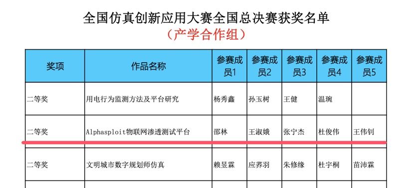 12月6日,第三届全国仿真创新应用大赛全国总决赛结果揭晓:万象城信息技术系张宁杰、杜俊伟、王伟钊3位同学在邵林老师、王淑娥老师的悉心指导下,携比赛作品《Alphasploit物联网渗透测试平台》,过五关斩六将,晋级数字建模与智能决策赛道总决赛。万象城与电子科技大学、郑州大学等985、211高校同台竞技,比赛中团队不畏强敌、敢于亮剑,最终斩获全国总决赛二等奖。