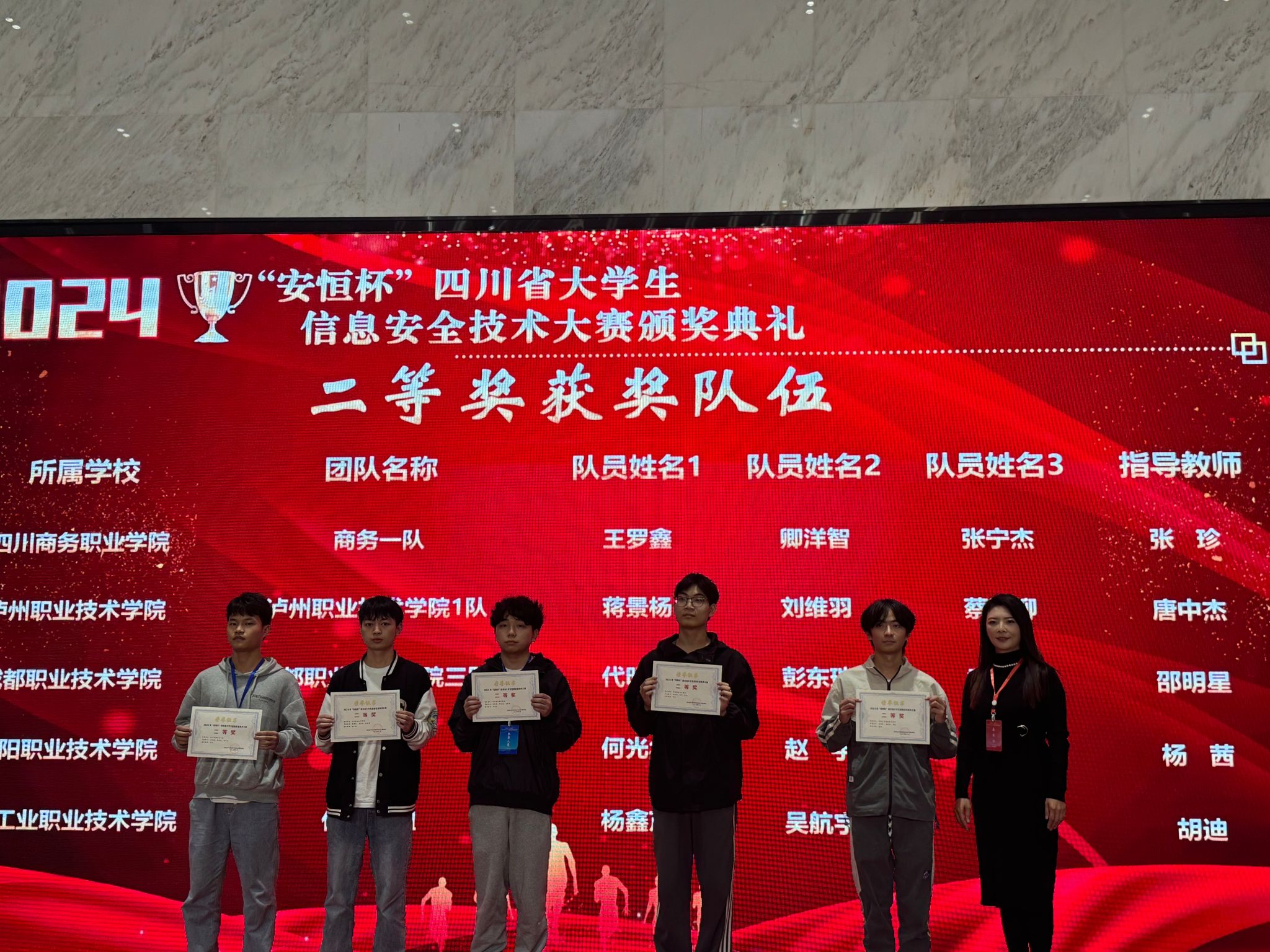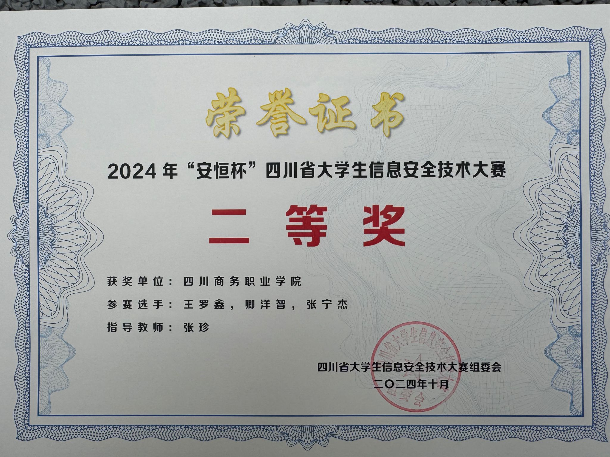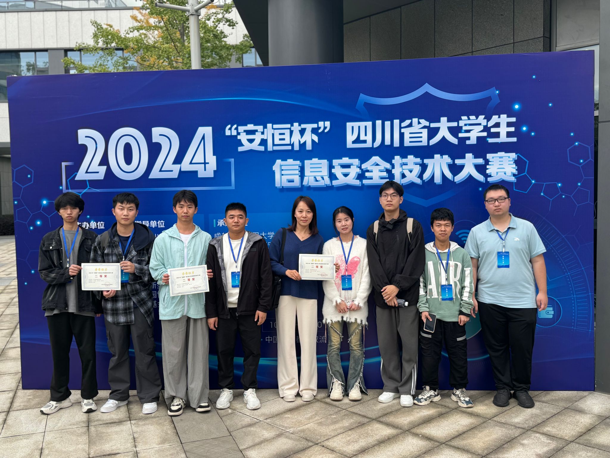 2024年10月,由四川省教育厅主办,中共四川省委网信办和四川省公安厅协办的2024年“安恒杯”四川省大学生信息安全技术大赛在成都信息工程大学双流新型产业学院举行,万象城信息技术系组织了3支队伍9名学生参赛,最终由张珍老师指导的商务一队斩获二等奖。