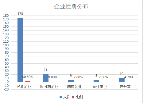 主要流向单位以企业单位为主,其中民营企业占比最高,其次为股份制企业,目前2名学生考上公务员,3位入职事业单位。