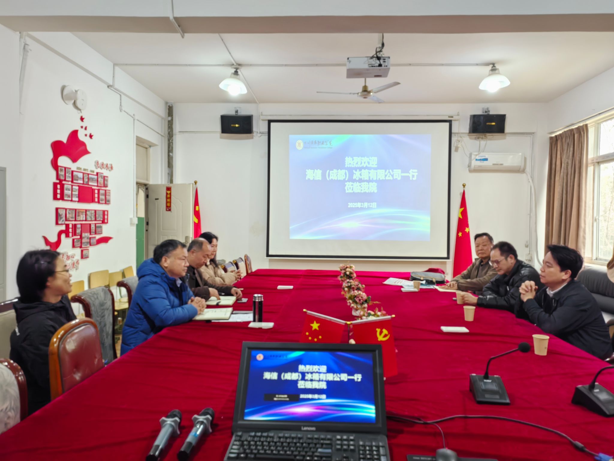 3月12日下午,海信(成都)冰箱有限公司教育事业部总经理张驰一行莅临万象城交流座谈。信息技术系党政负责人及就业干事参加座谈。